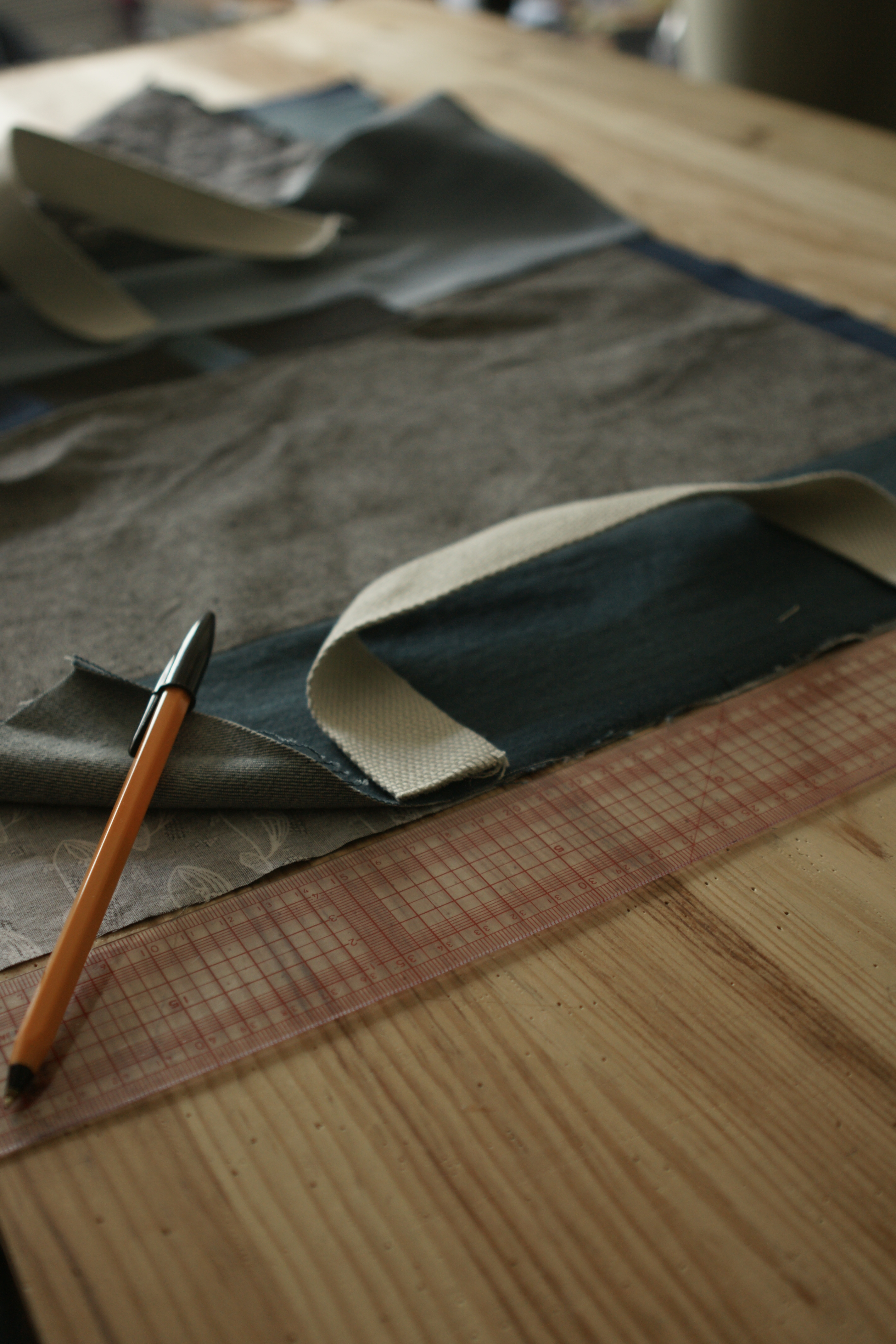 Coupez deux morceaux de 30cm, mettez les de côté. Pliez un de vos tissu en deux et marquez le milieu avec un coup de craie. De chaque côtés, un autre petit coup de craie à 7.5cm, c’est là que vous allez épingler vos sangles.
