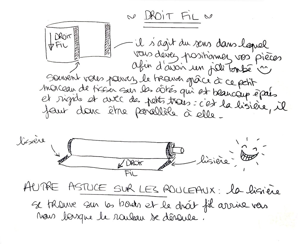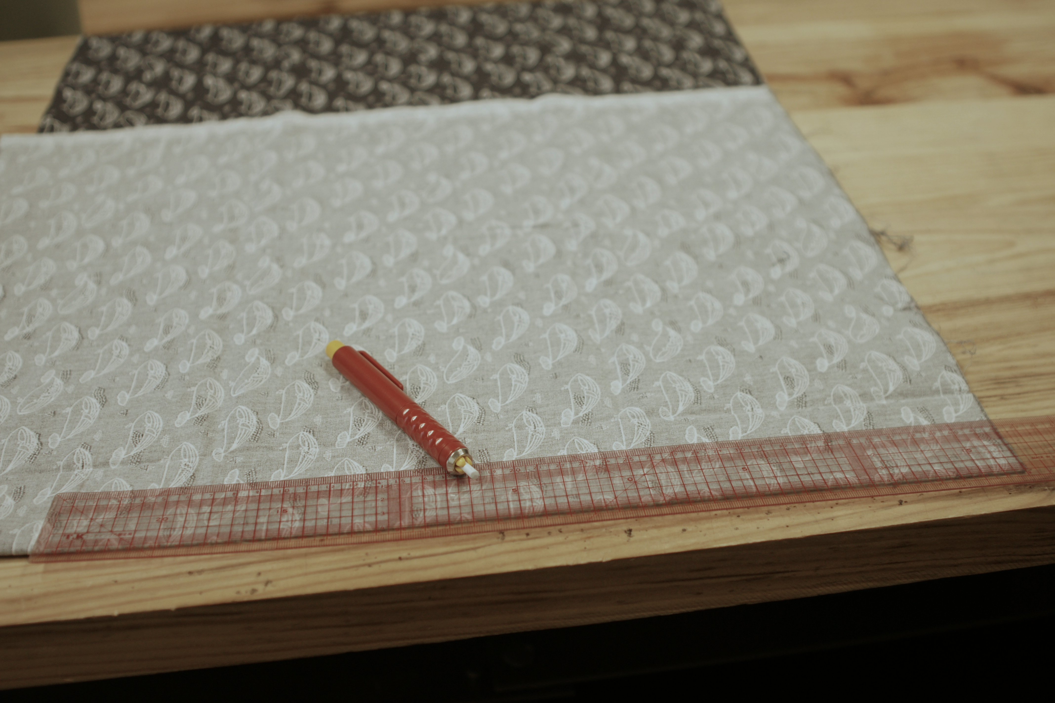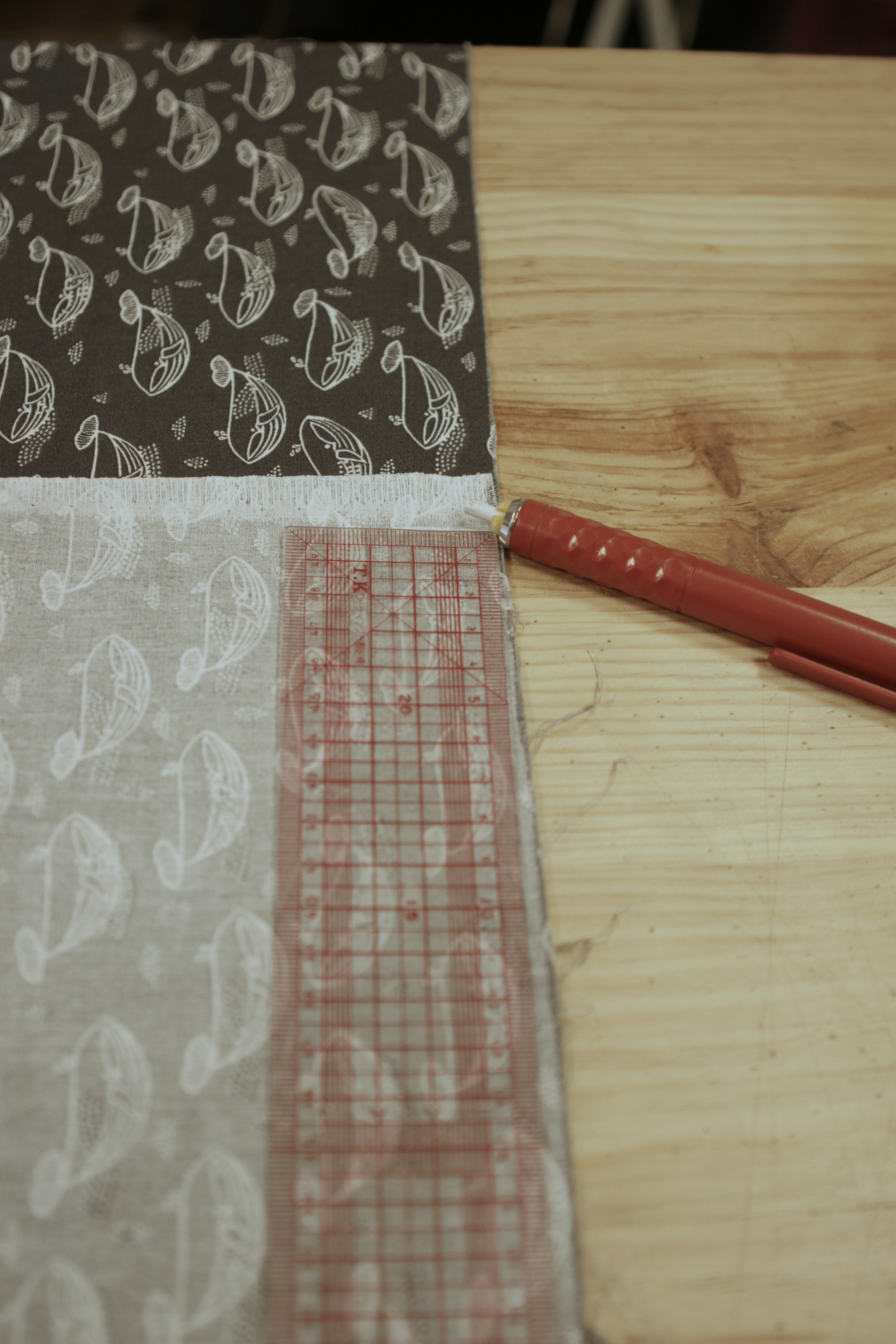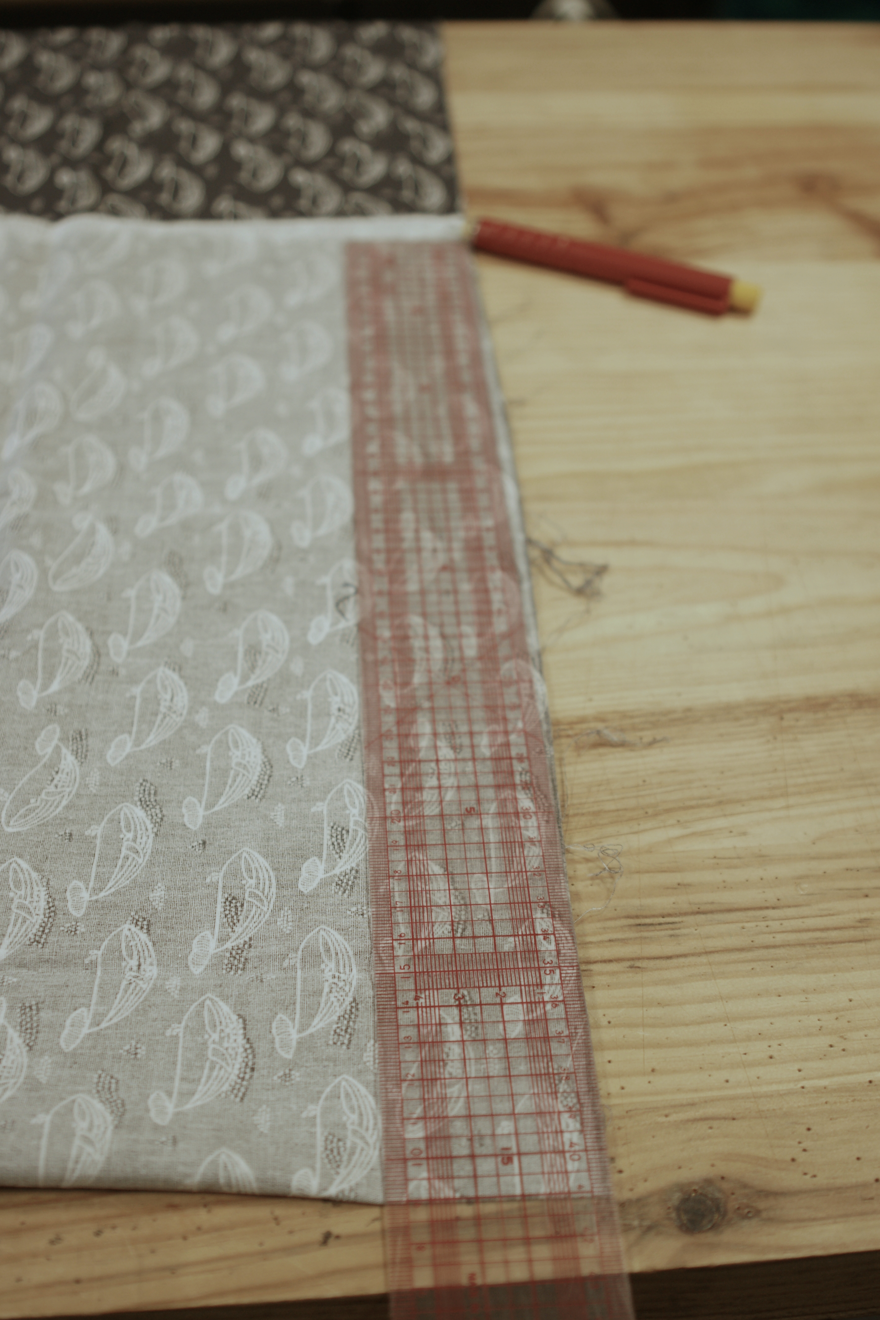 Tracez à la règle sur vos morceaux de tissu dans le sens du DROIT FIL (parallèle à la lisière) et AU PLI. Ici, vous pouvez placer les 76cm à l’horizontal sur votre métrage de tissu, il n’y a aucun soucis.