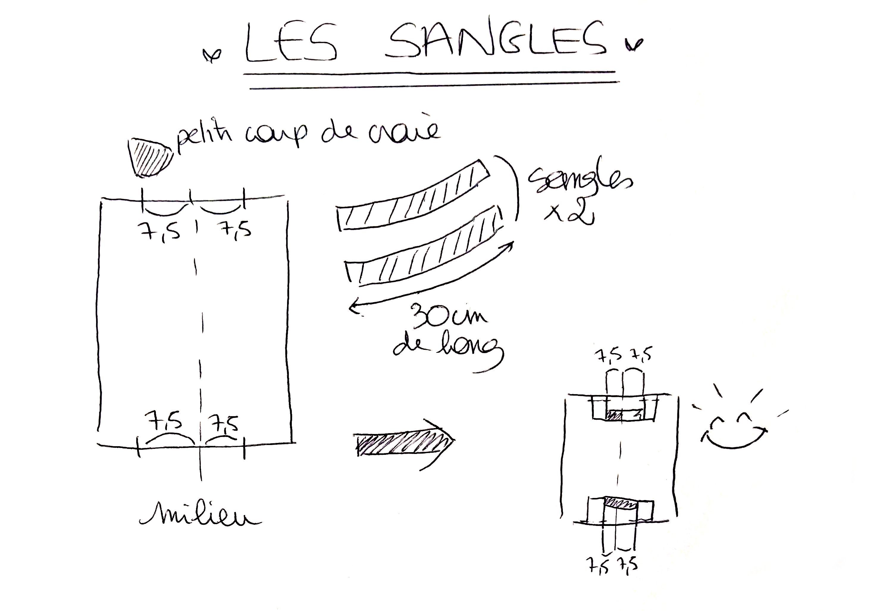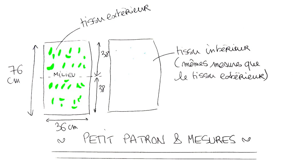 Petit dessin rapide du patron pour vous donner les mesures que j’ai utilisé pour réaliser mon sac:
