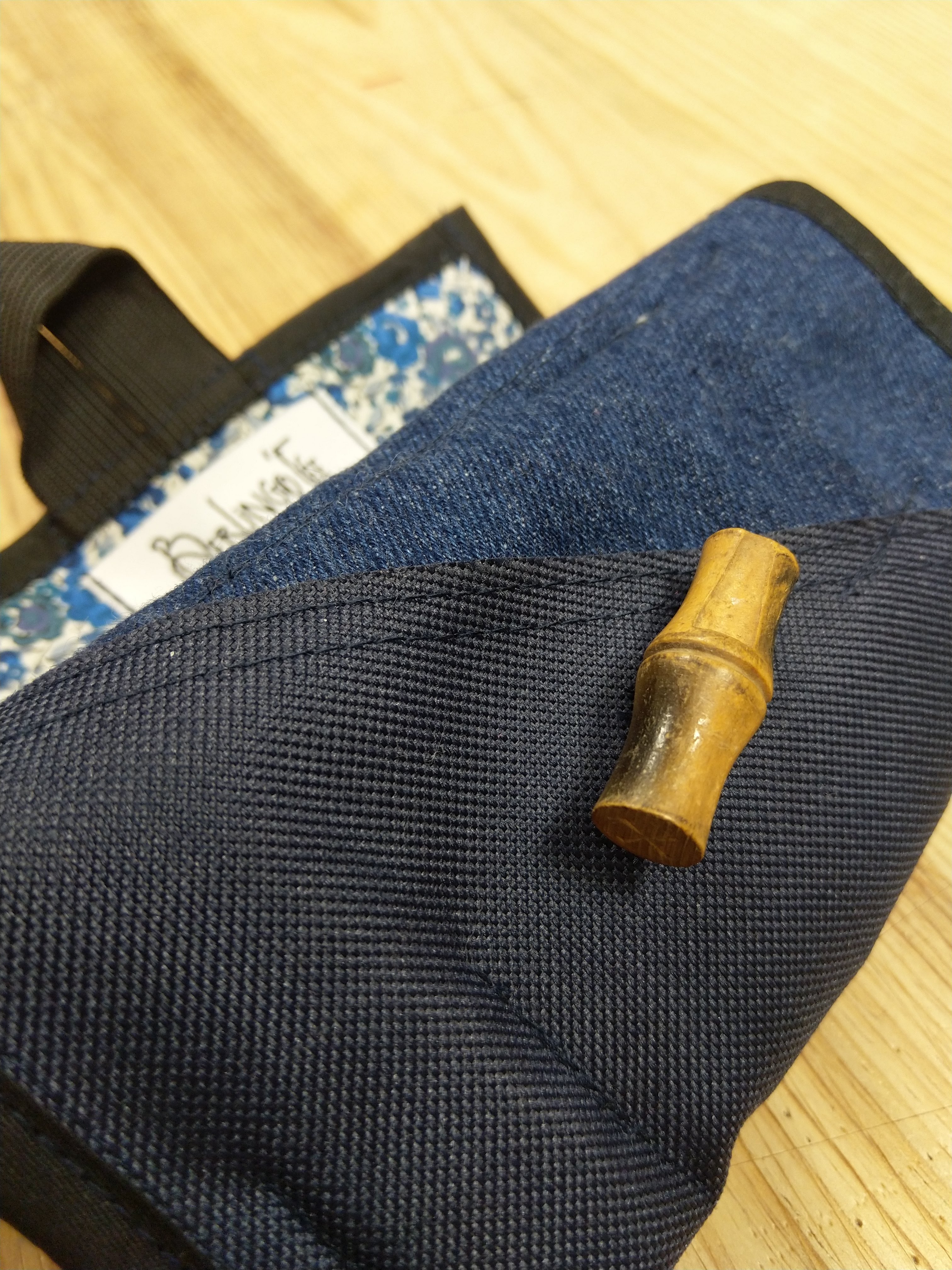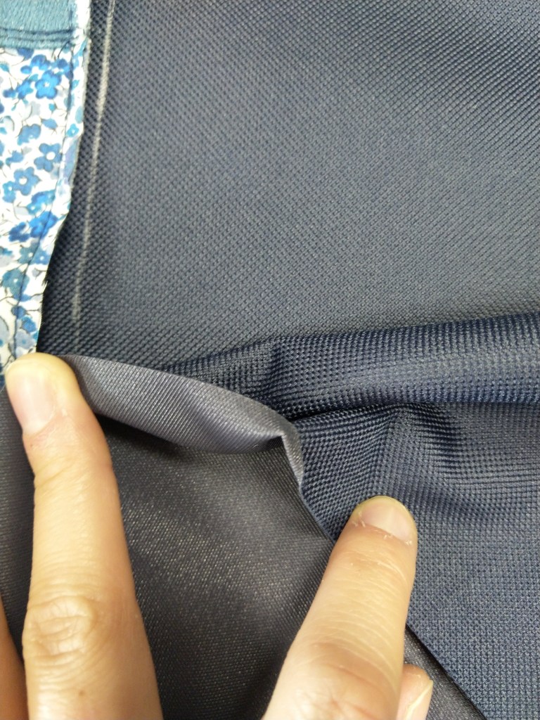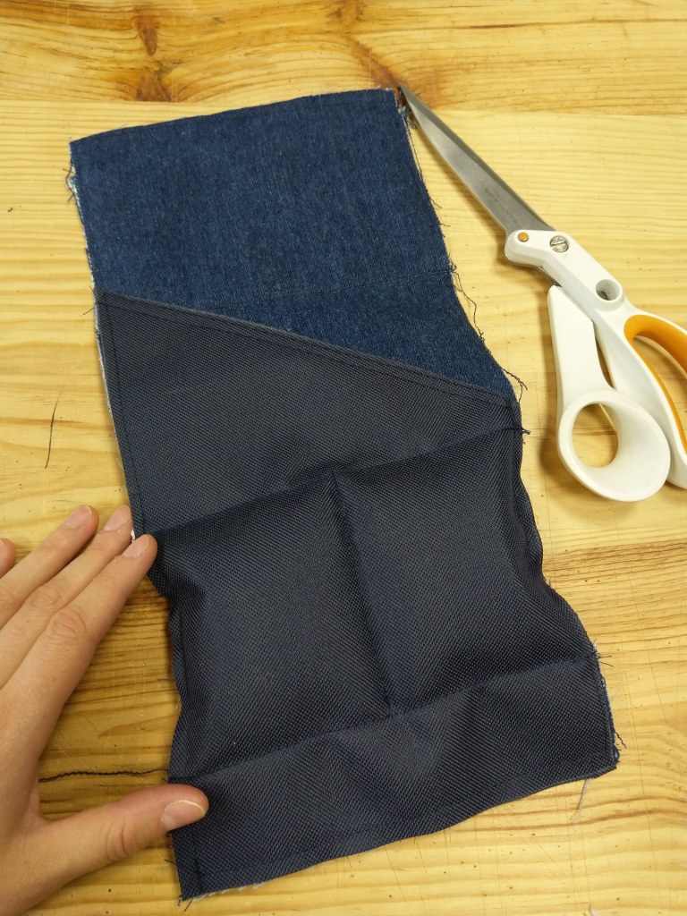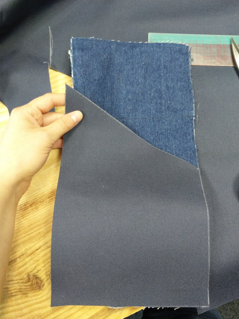 Je préfère avoir une pochette solide et waterplouf (on ne sait jamais, dans notre sac, une bouteille peut tellement facilement s’ouvrir…) c’est pourquoi j’ai rajouté une partie en nylon imperméable sur la partie extérieure de ma pochette. Vous n’êtes pas obligé(e)s de le faire, mais si vous avez l’habitude d’avoir deux mains gauches (ou droites, ça dépend) je vous le conseille!