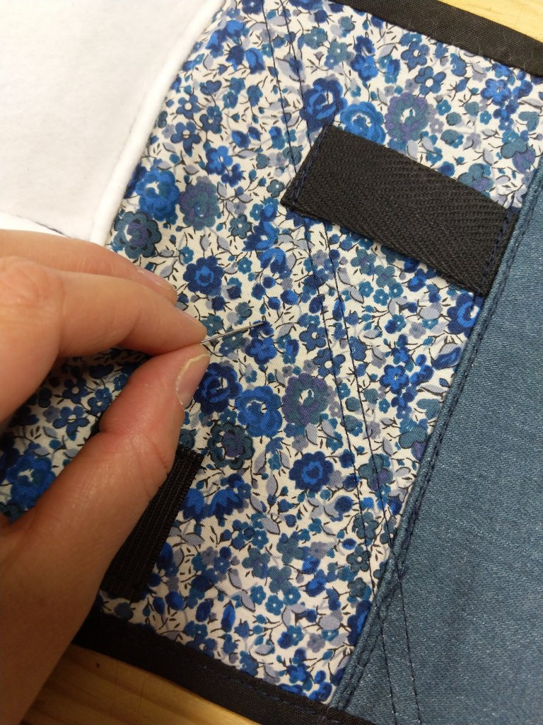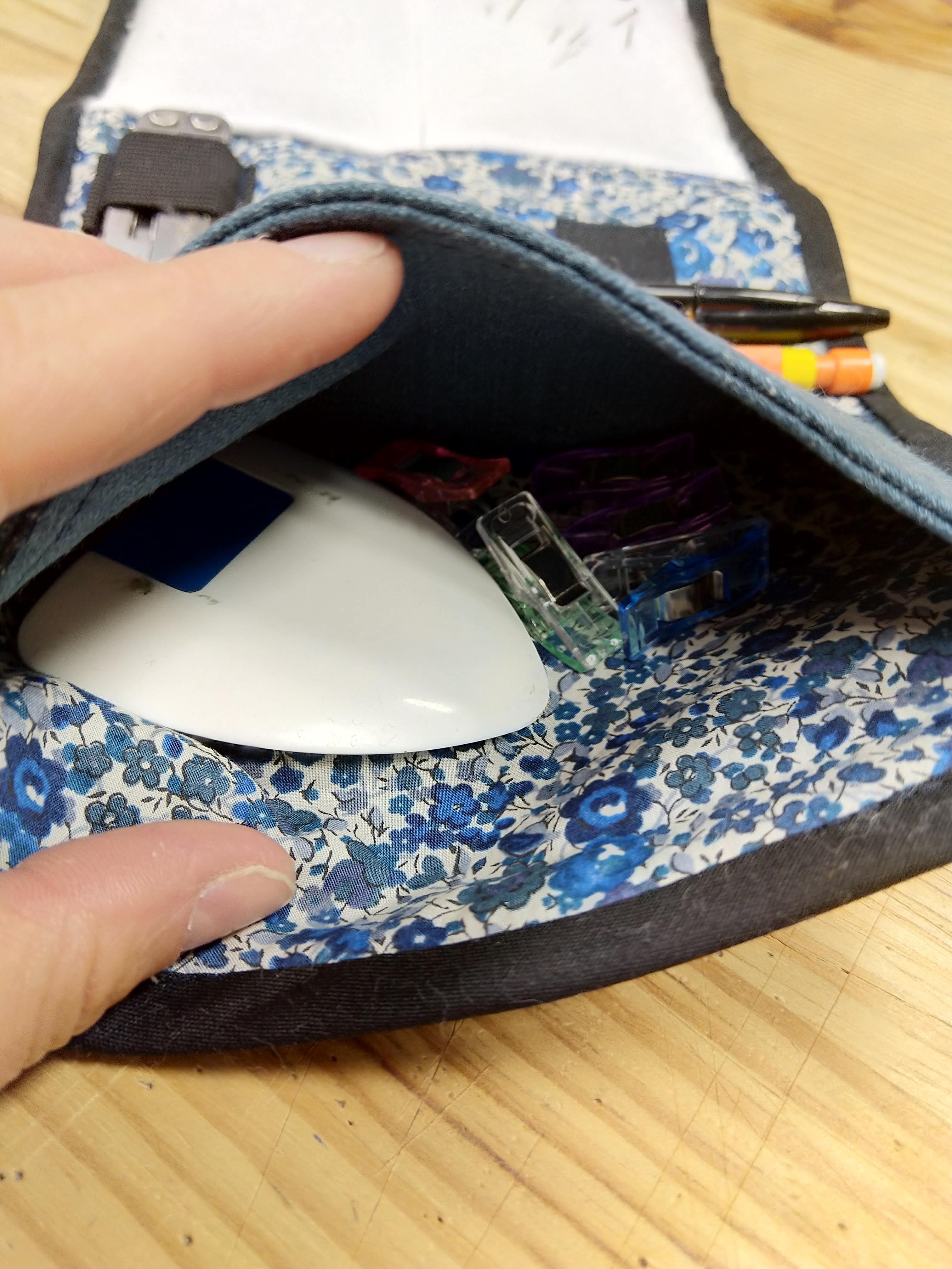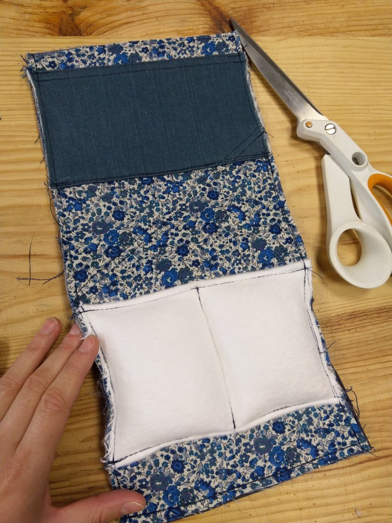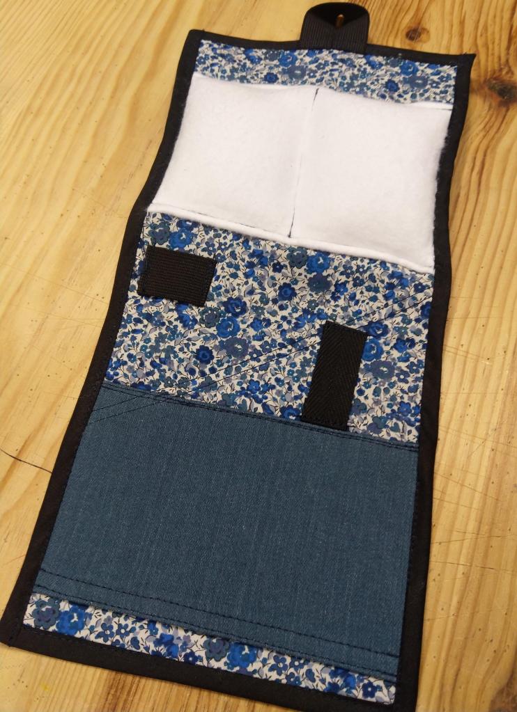 Refermez votre pochette : rabattez la poche vers l’intérieur, puis cette partie contre le « pique aiguilles » (ainsi celles-ci sont protégées et vos doigts aussi si vous fouillez dans vos affaires!).