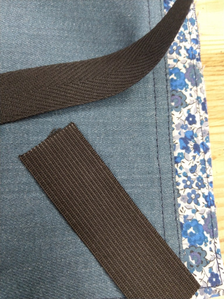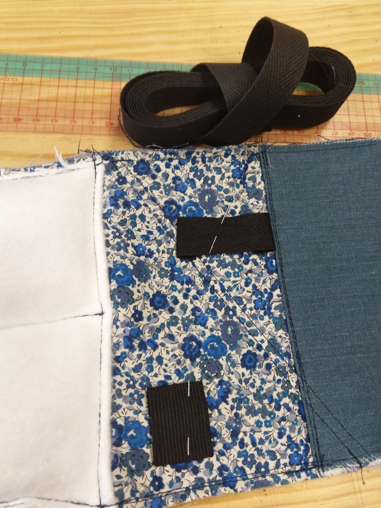 Nous allons nous occuper des petites attaches du milieu pour les stylos, crayons et mini ciseaux. Voici les deux sortes d’élastique (en bas) et sangle (en haut) que j’ai utilisé: