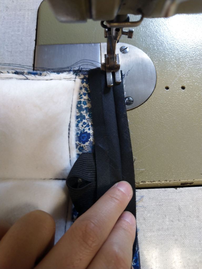 Coupez 4 morceaux de biais: un pour le haut et un pour le bas (même taille) de 16cm. Pour les côtés, coupez pour avoir une longueur de 36cm (petit plus pour rentrer le biais proprement à l’intérieur).