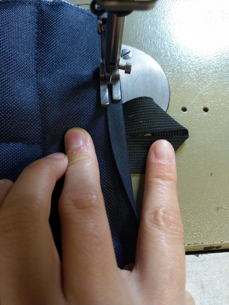 Ensuite, placez le biais de 16cm par dessus et cousez le tout du long (photo1). Rabattez le biais et le passant et épinglez le afin qu’il reste bien en place (photo2) . Retournez votre pochette, rabattez votre biais sur la couture et cousez en nervure du bord (photo 3&4)