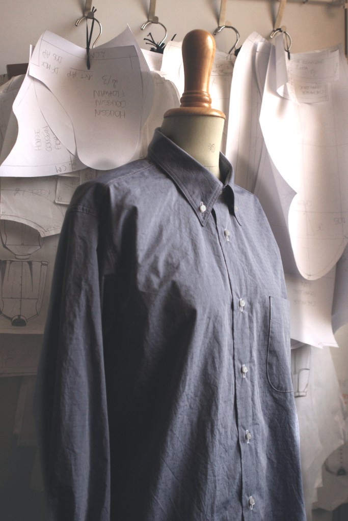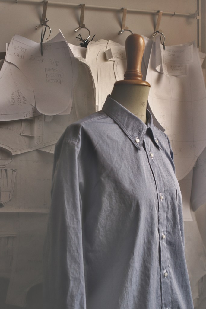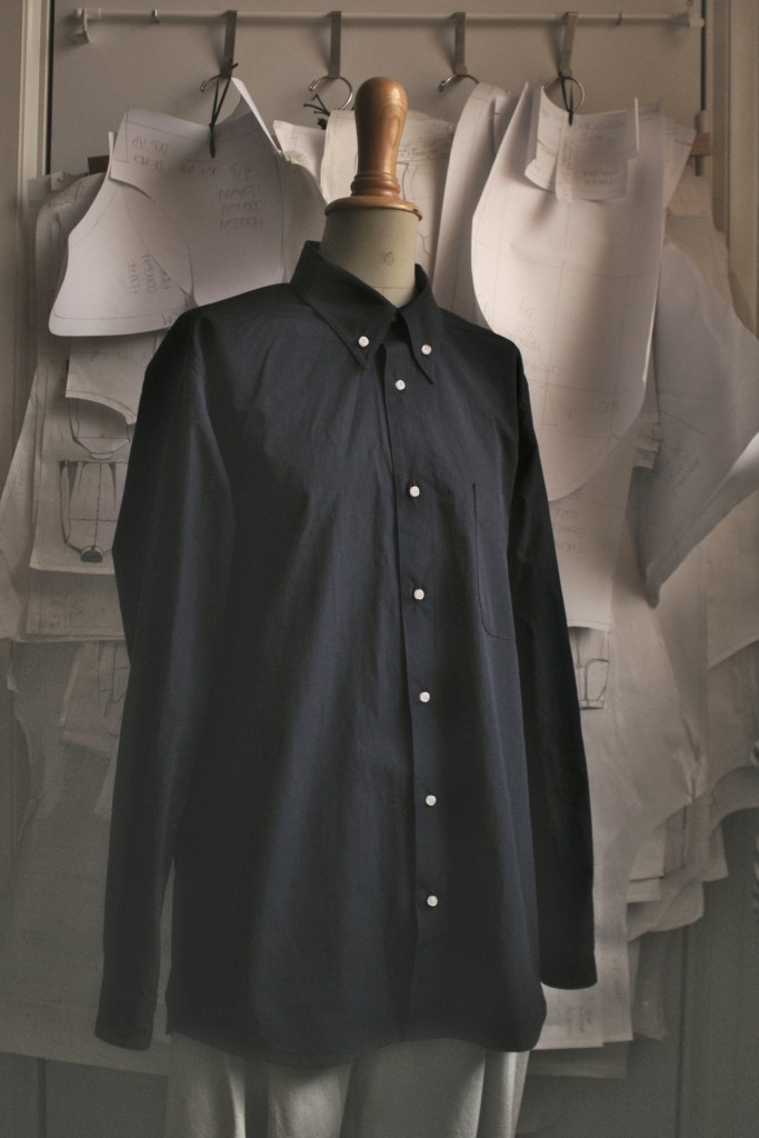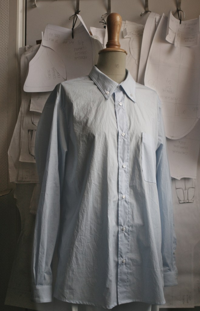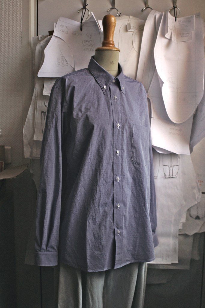 Il y a quelques temps, un client est venu me demander plusieurs chemises en popeline de coton, dans les teintes bleutées. Pour la forme et le style, il m’en avait apporté une à lui qu’il ne portait plus car elle était abîmée; je pouvais donc m’en servir comme base pour réaliser sa commande.