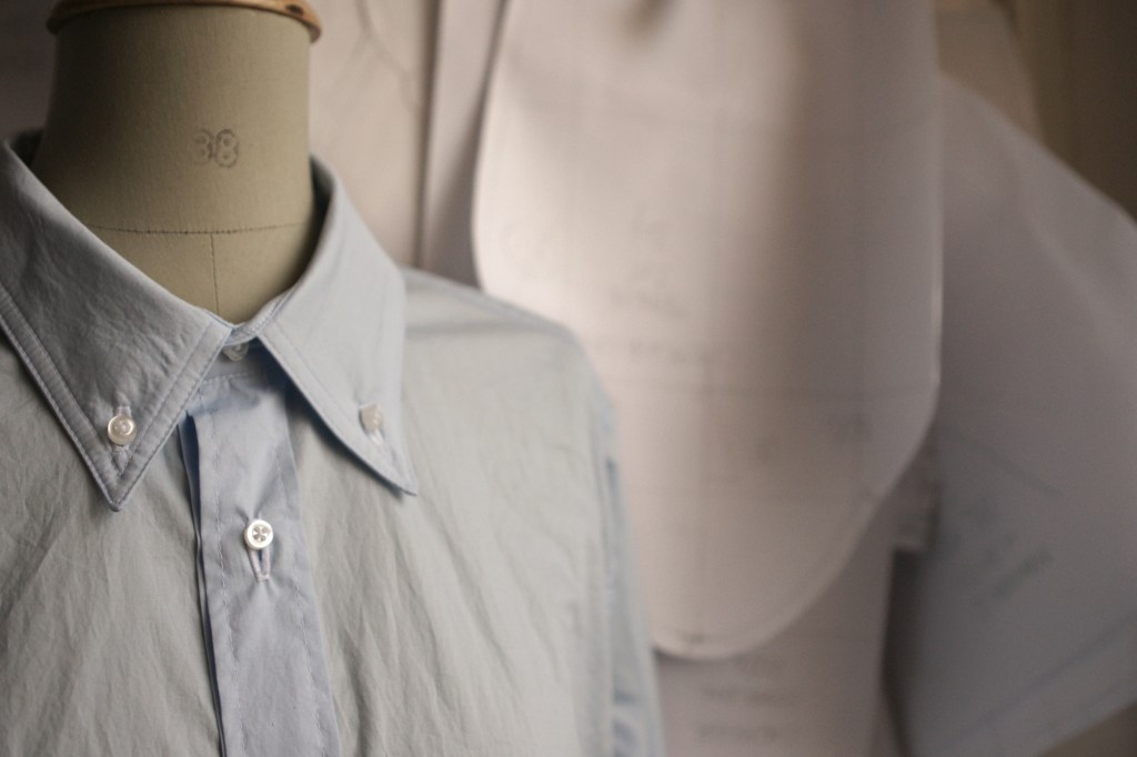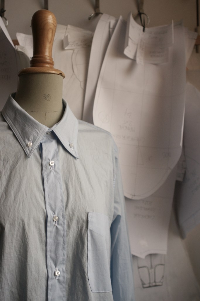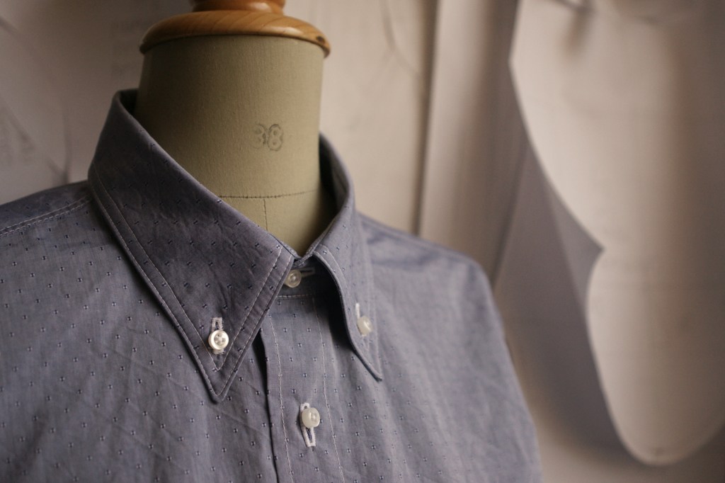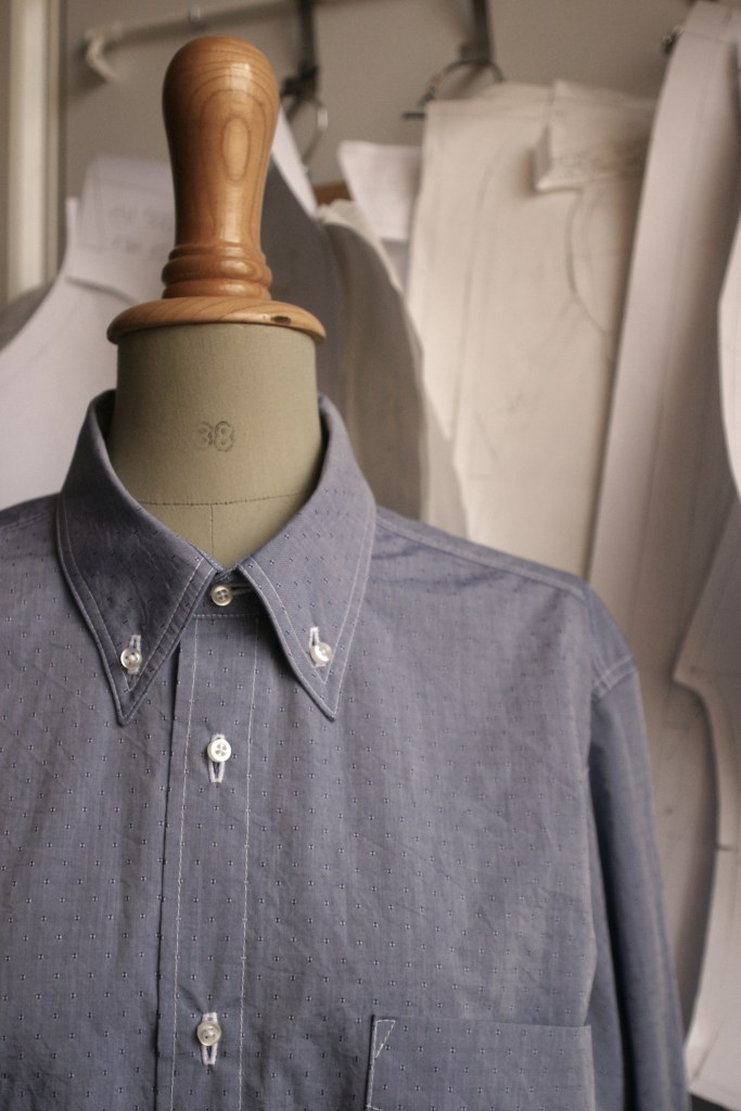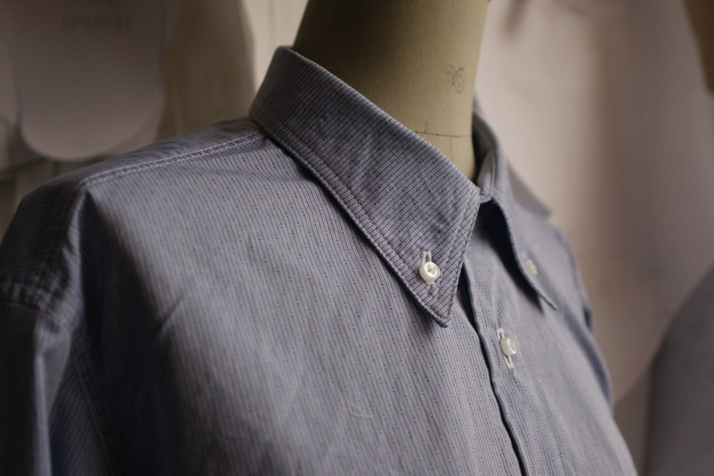 Il y a quelques temps, un client est venu me demander plusieurs chemises en popeline de coton, dans les teintes bleutées. Pour la forme et le style, il m’en avait apporté une à lui qu’il ne portait plus car elle était abîmée; je pouvais donc m’en servir comme base pour réaliser sa commande.